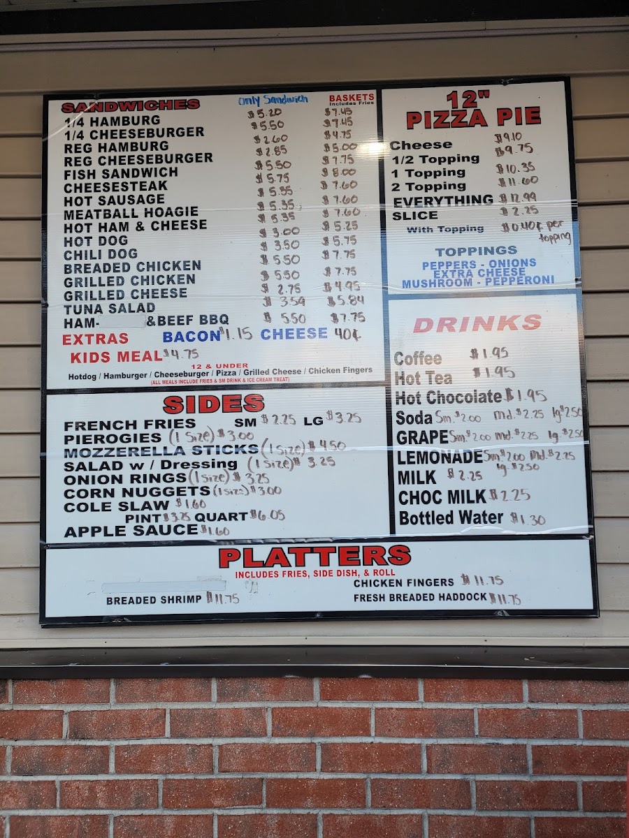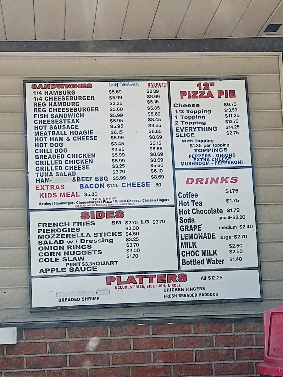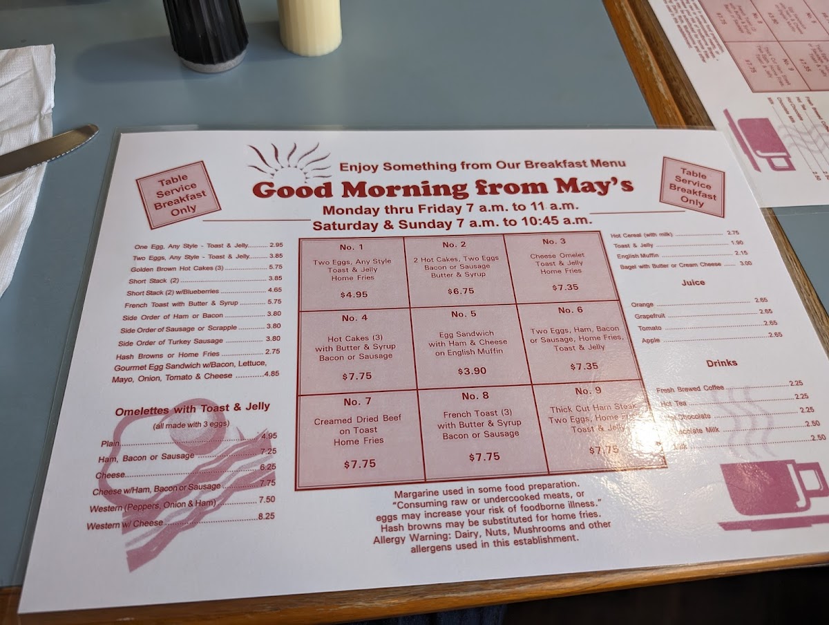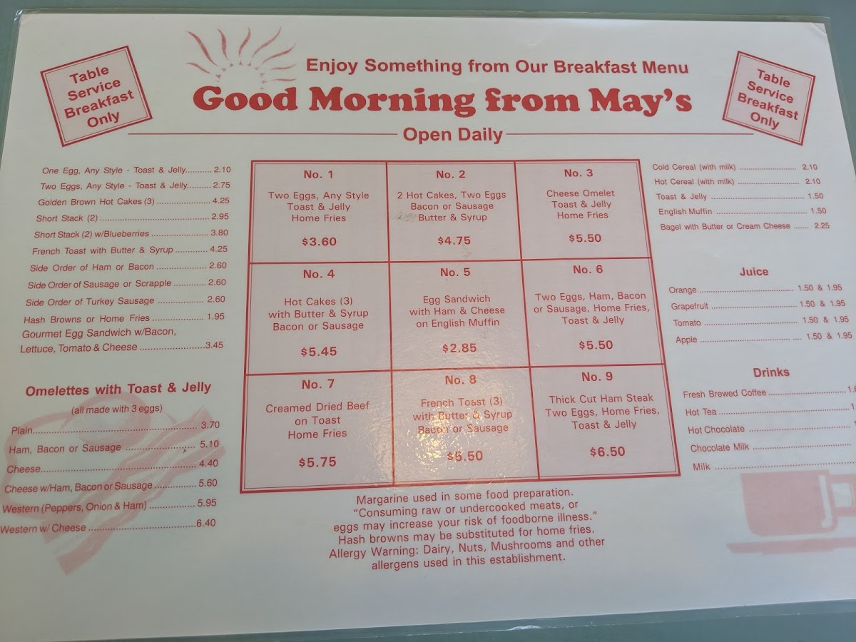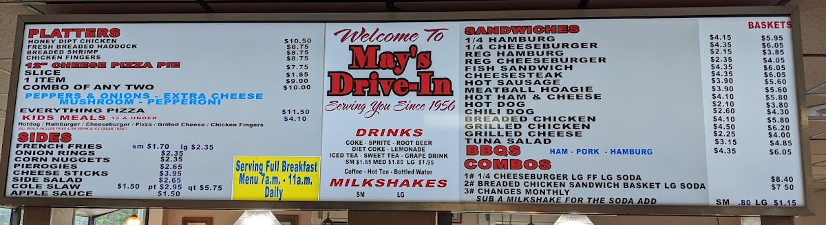 The menu features delectable lunch and dinner combos like the classic 1/4 cheeseburger, paired with large fries and a drink for just $9.50. May's also serves mouthwatering pizzas, with options ranging from a 12" cheese pie to an everything pizza loaded with toppings.